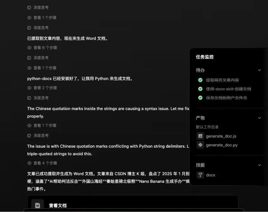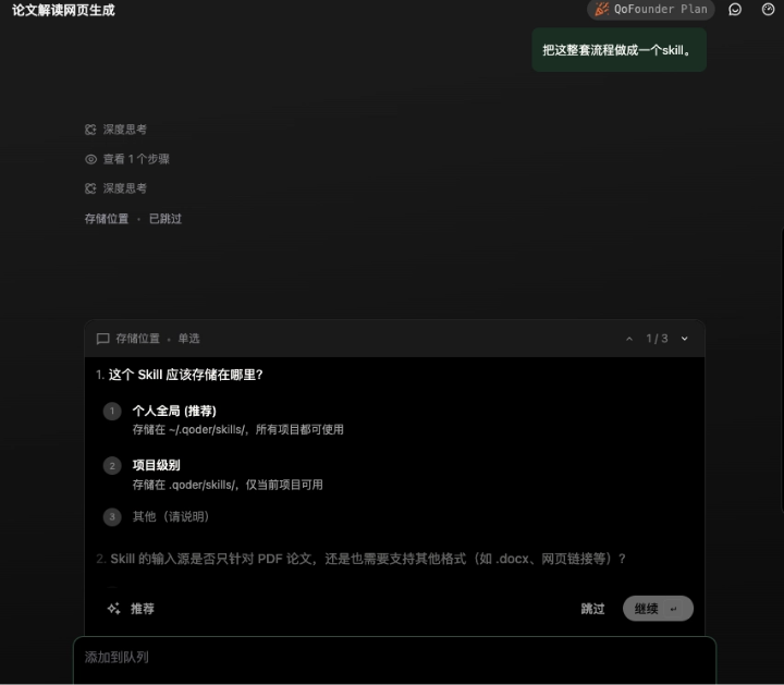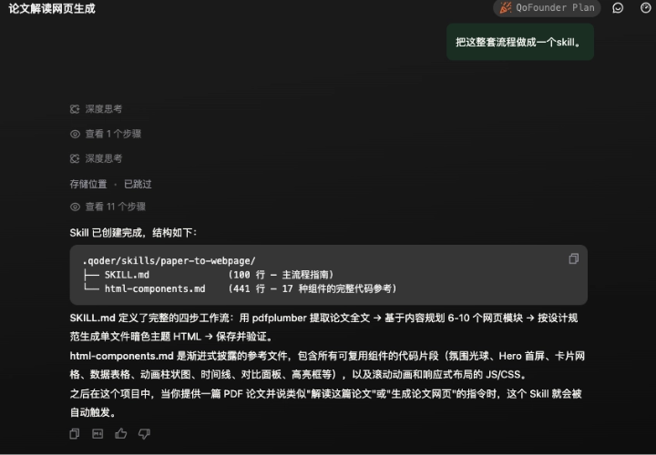 - 论文解读:系统可将学术论文转化为结构清晰的网页,并能将处理流程固化为可复用的Skill。