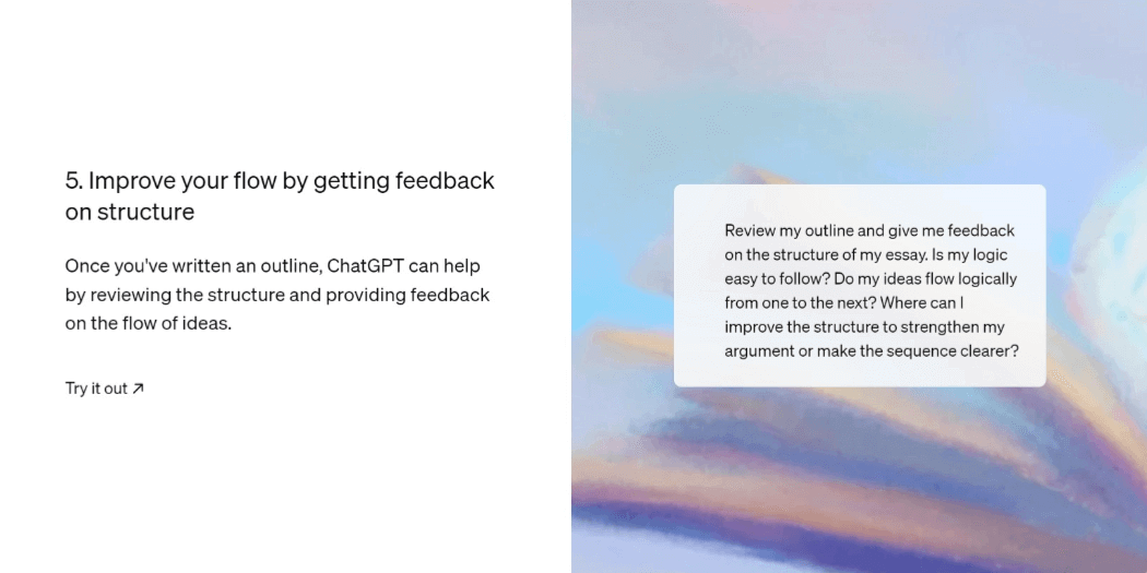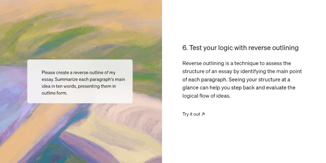 - 审阅我的提纲,并就我的文章结构给我反馈。我的逻辑是否容易理解?我的想法是否合乎逻辑?我可以在哪里改进结构以加强我的论点或使顺序更清晰?