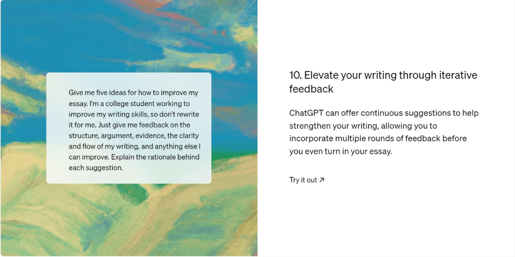 - 给我五条改进论文的建议。我是一名正在努力提高写作技巧的大学生,所以不要帮我重写。只需给我关于结构、论点、证据、写作清晰度和流畅度以及我可以改进的任何其他方面的反馈。解释每条建议背后的理由。