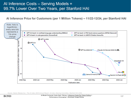 AI模型计算成本高企/上升 + 单次推理成本下降 = 性能趋同 + 开发者使用量增长