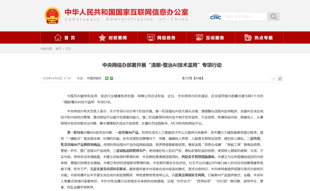 中央网信办启动"清朗·整治AI技术滥用"第二阶段行动