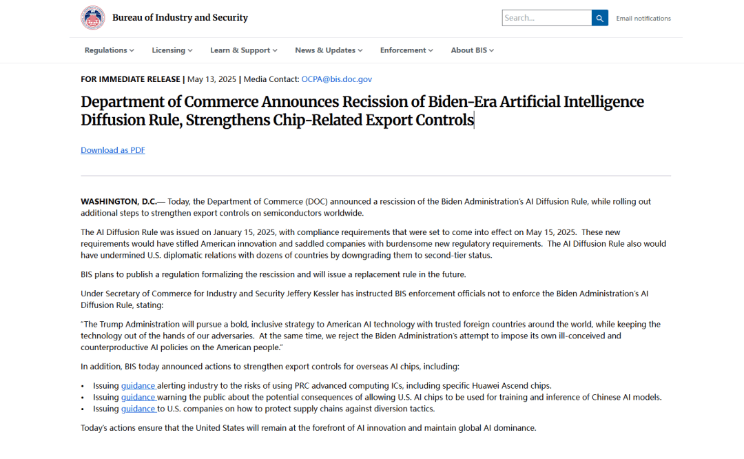 美国商务部宣布废除《AI扩散规则》,同时禁止全球使用华为昇腾AI芯片。新规以双边协议取代原有复杂分级制度,在强化供应链管控的同时,为美国科技企业创造有利条件。