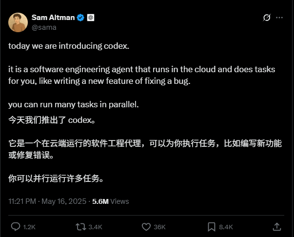 OpenAI发布基于云端的AI编程助手Codex,支持并行处理编码和错误修复等任务,目前以研究预览形式向付费用户开放。