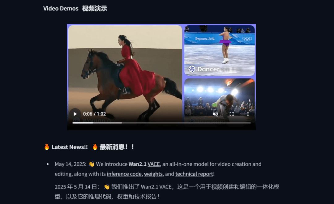 通义万相Wan2.1-VACE支持文生视频、视频重绘等全系列生成和编辑能力。