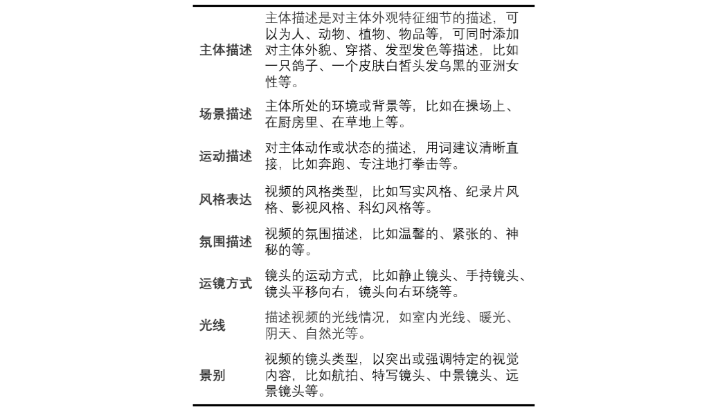 核心要素是主体、场景和运动,其他修饰可通过系统预设标签补充。