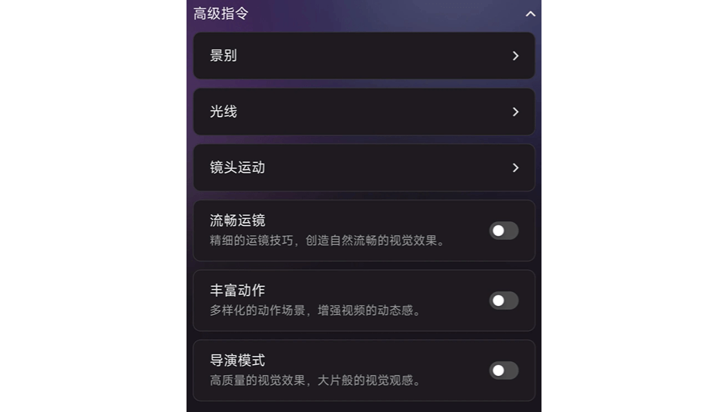 - 模板3:主体+场景+运动+风格+氛围+运镜+光线+景别