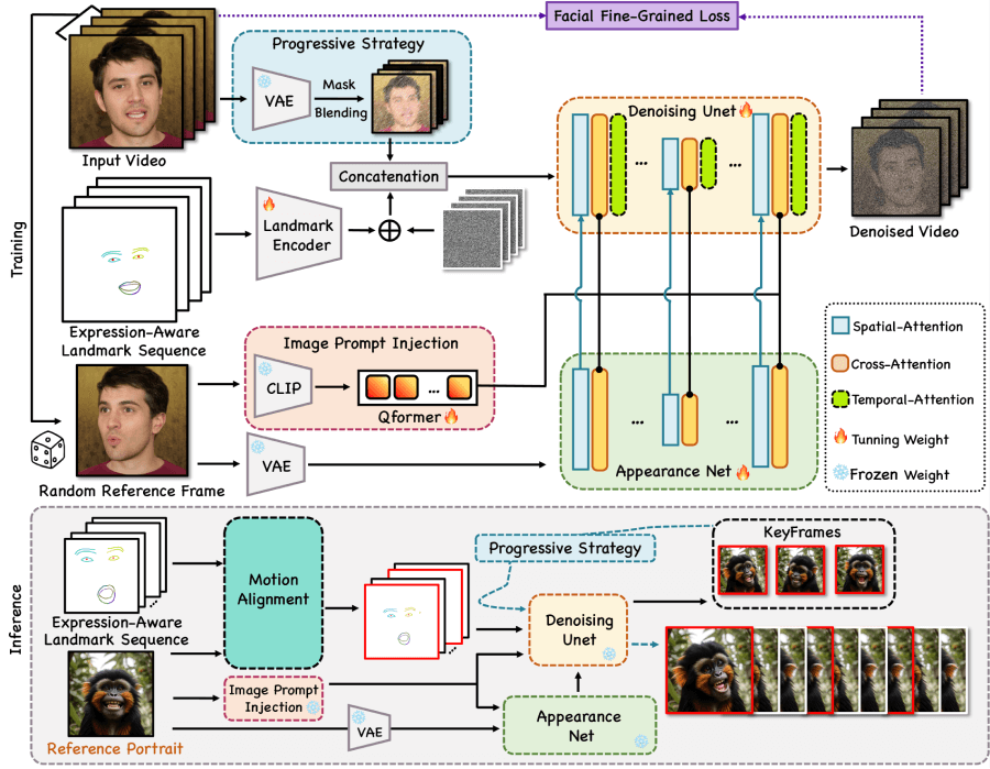 - 推理与动画生成:结合表情标志点与时间注意力,输出动态肖像动画。
