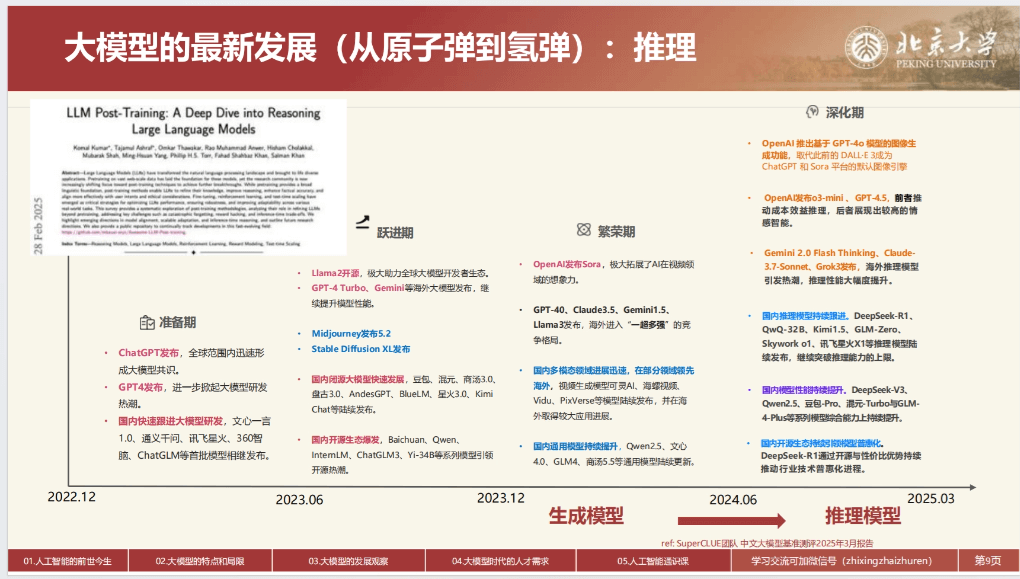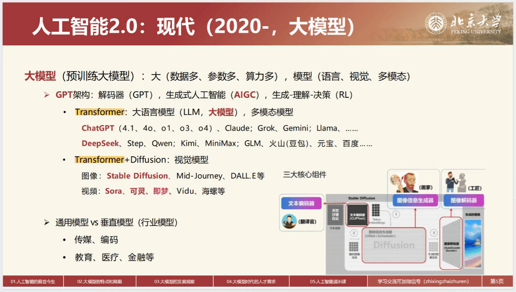 - AI 2.0(2020-至今):本阶段进入大模型时代,以GPT/Stable Diffusion为代表的多模态生成模型实现文本、图像、视频的跨模态交互,同时推理能力显著提升(如DeepSeek R1模型)。
