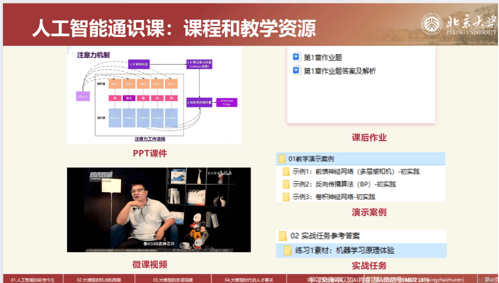 - 课程内容:涵盖人工智能基础、核心技术(如Transformer架构)、应用领域(金融、医疗、教育等)以及面临的挑战与未来发展方向,构建完整的知识体系。