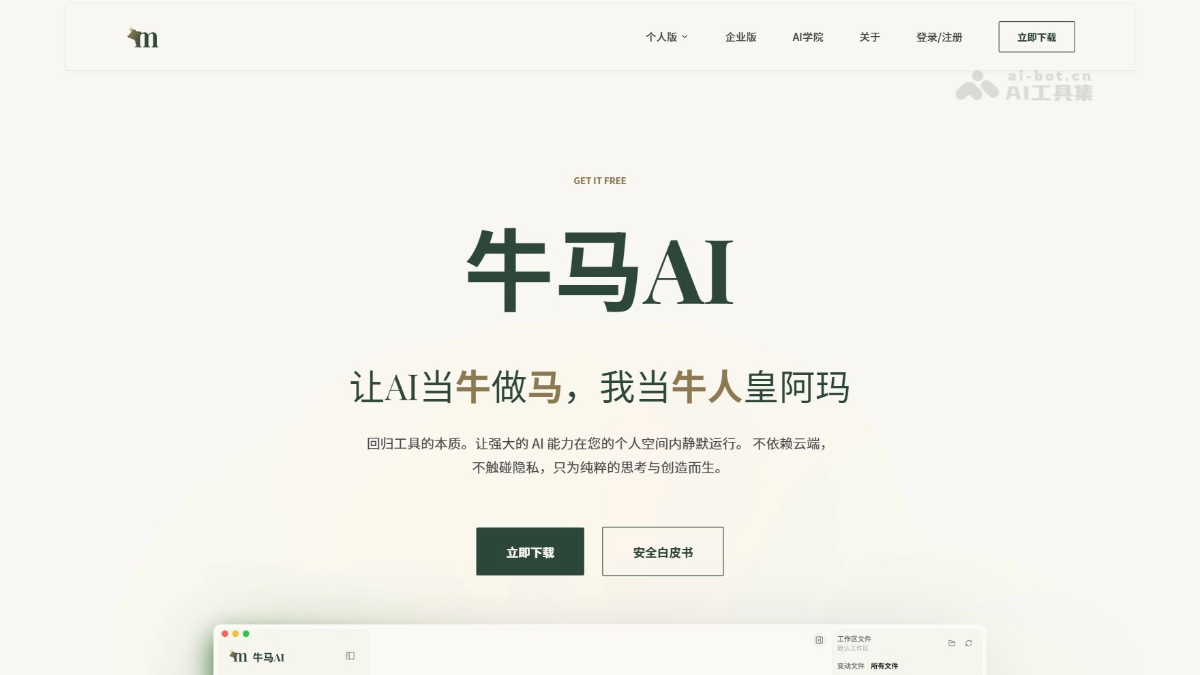 牛马AI作为一款革新性生产力工具,通过本地化部署和智能协同设计,为用户提供安全高效的AI办公解决方案。