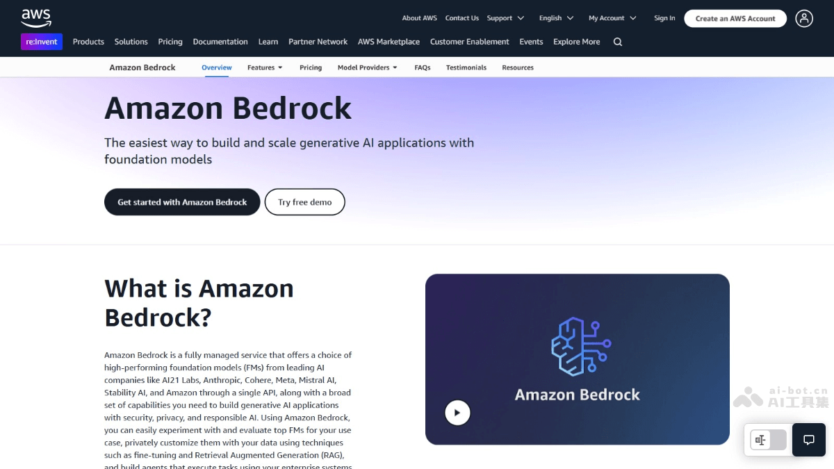 Amazon Bedrock整合Claude、Meta等顶级AI公司的模型资源,通过托管服务提供模型微调和部署能力,支持400余款商业及开源模型。
