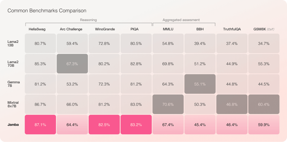基准测试数据显示,Jamba在HellaSwag、ArcChallenge等多项评估中表现卓越。无论是语言理解还是科学推理任务,其性能均超越同尺寸的主流模型,包括Llama2系列和Gemma等竞争对手。