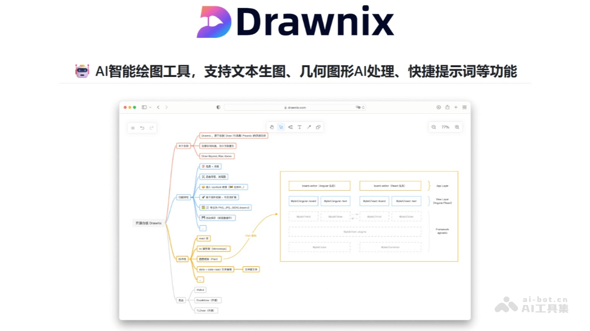 这款基于React 18和TypeScript开发的AI绘图工具,集成了文本转图像、几何图形智能优化等创新功能。除了支持思维导图和流程图制作,还提供自由绘制、无限画布等专业特性,适配各类移动设备并具备自动保存机制。