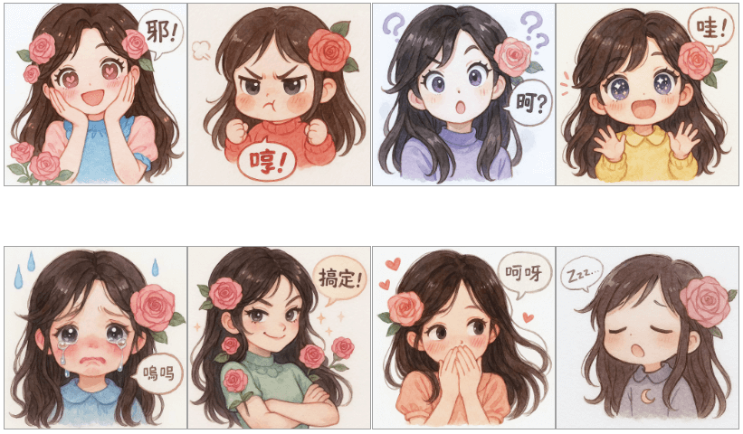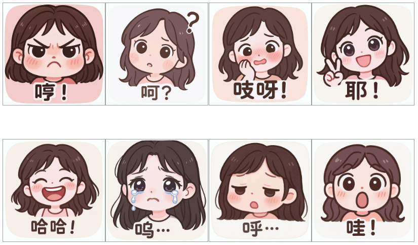 在表情包创作测试中,工具展现了强大的个性化定制能力。上传参考图片后,系统能创作出具有个人特色的系列表情。