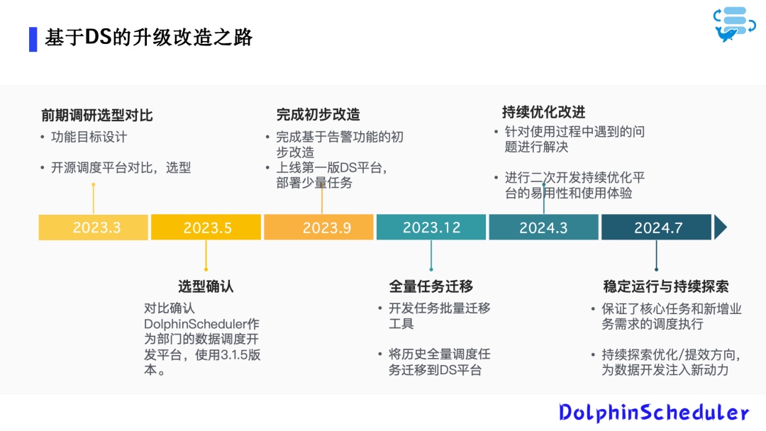 图示显示2023年邮件系统引入Apache DolphinScheduler调度平台的重要节点。