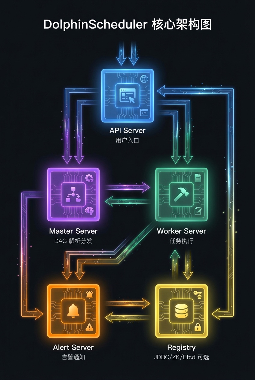 DolphinScheduler采用去中心化架构,由五大核心组件构成:
