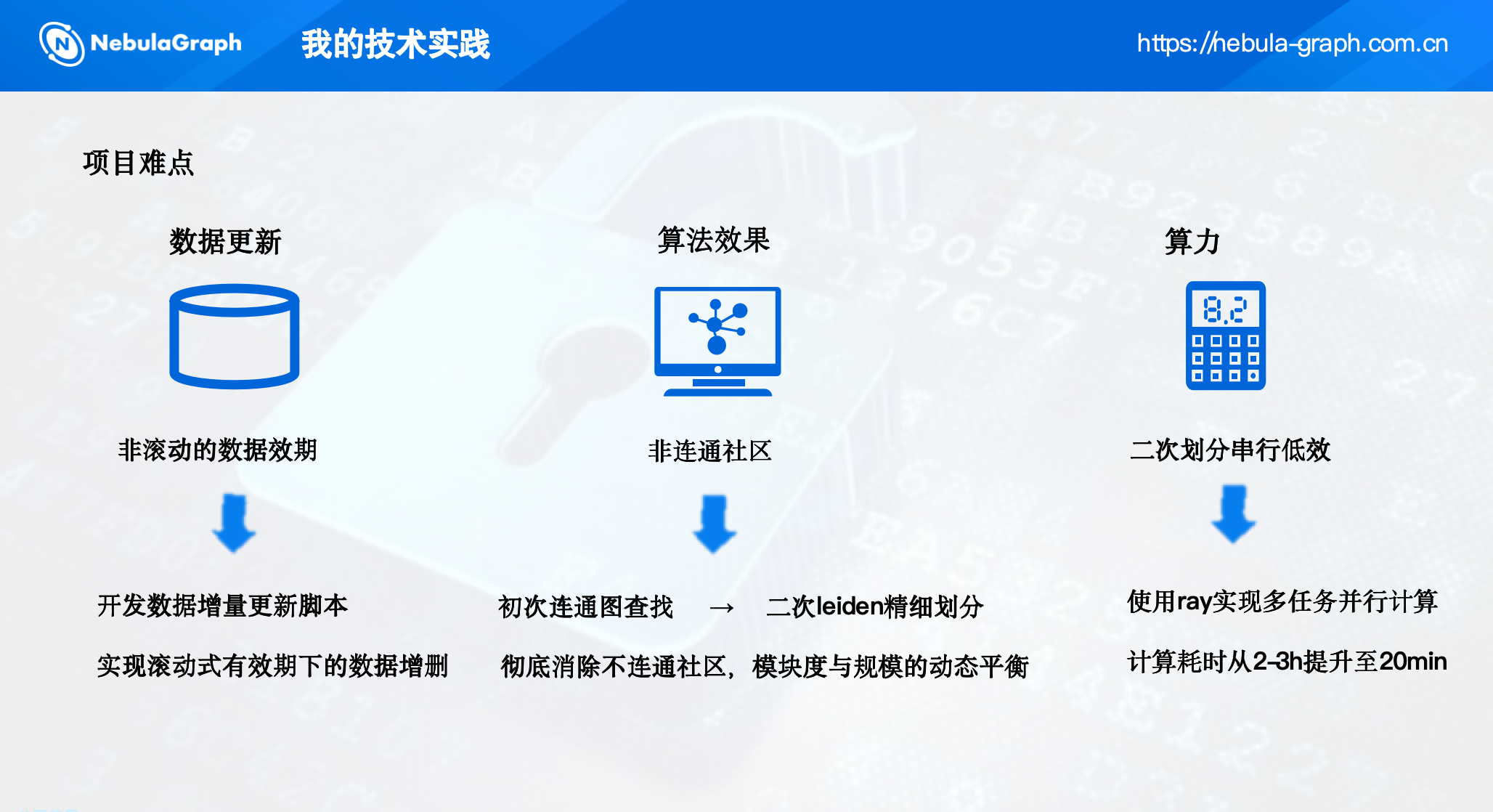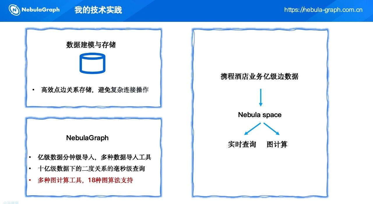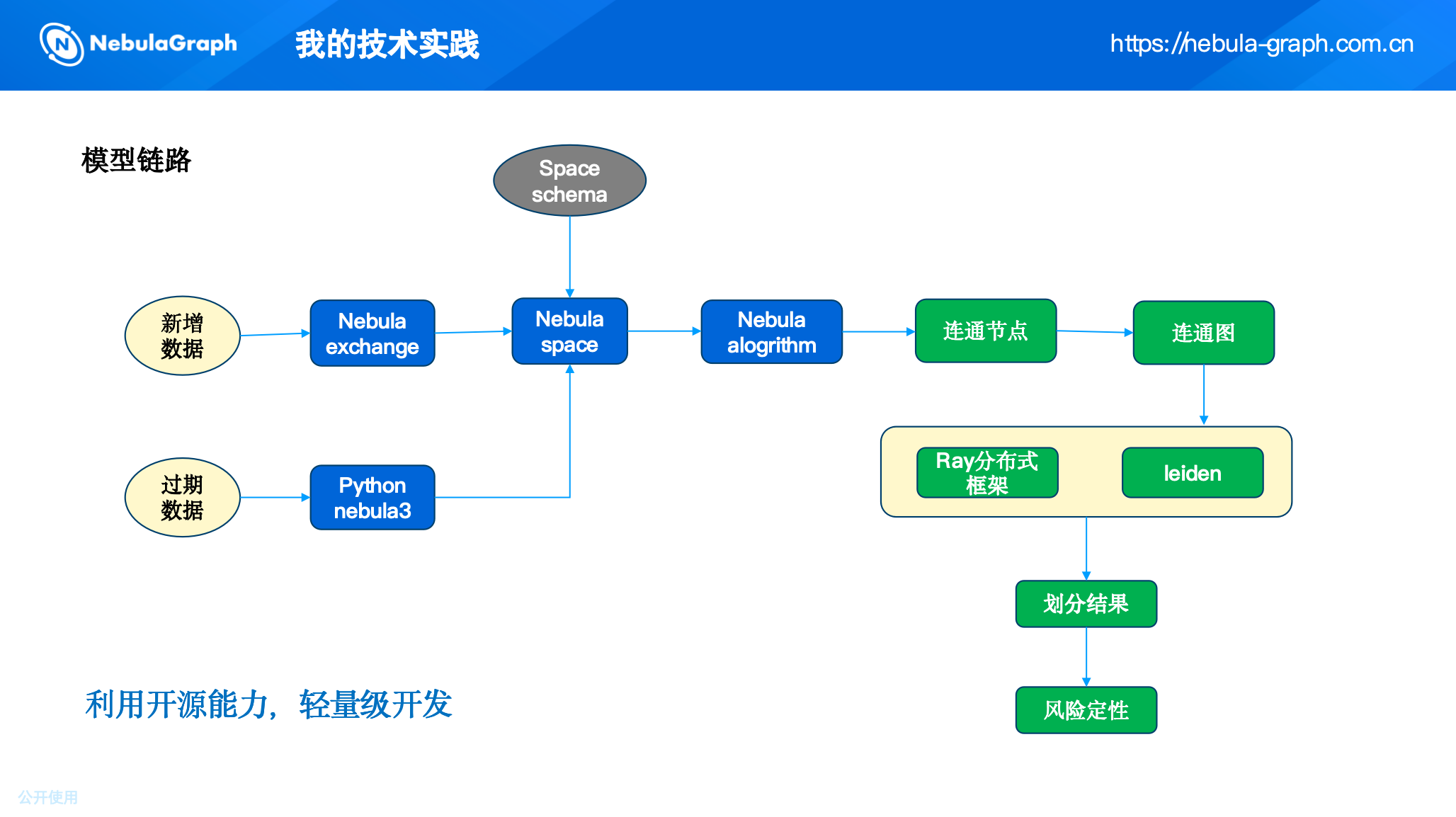 - 生态完善:NebulaGraph内置了18种图算法,并提供了与图计算框架的衔接能力。我们可以直接调用内置的连通组件算法进行预计算,再结合外部分布式框架做精细划分,极大降低了开发成本。