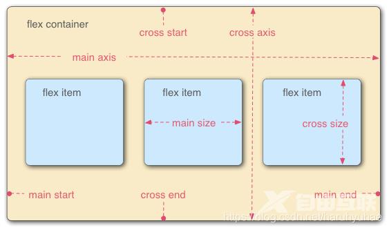 容器默认存在两根轴:水平的主轴(main axis)和垂直的交叉轴(cross axis)。主轴的开始位置(与边框的交叉点)叫做main start,结束位置叫做main end;交叉轴的开始位置叫做cross start,结束位置叫做cross end。