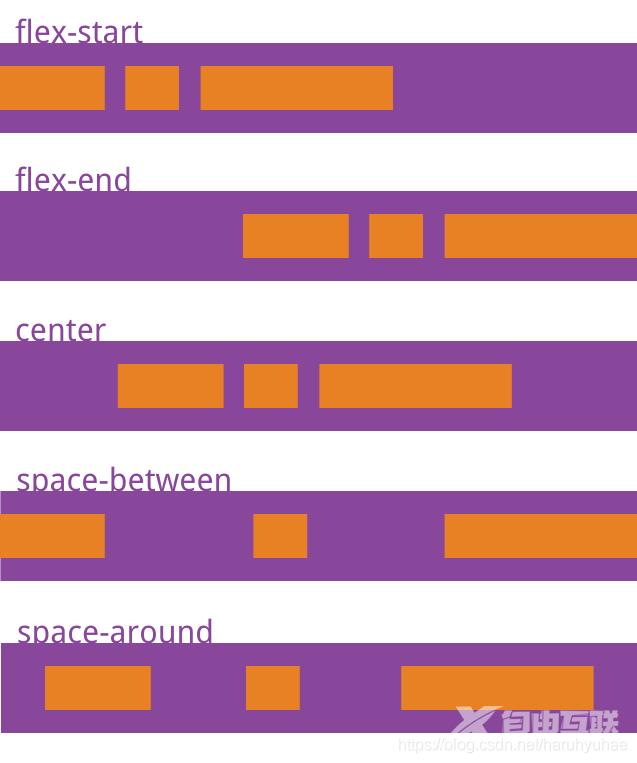 - space-around:每根轴线两侧的间隔都相等。所以,轴线之间的间隔比轴线与边框的间隔大一倍。