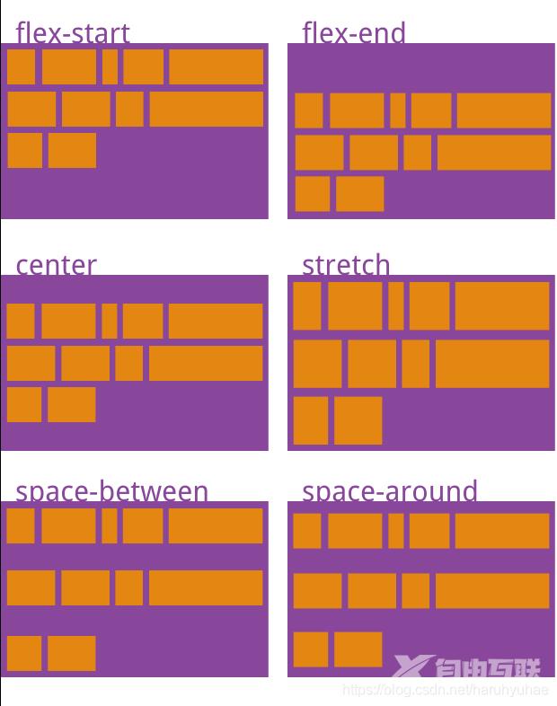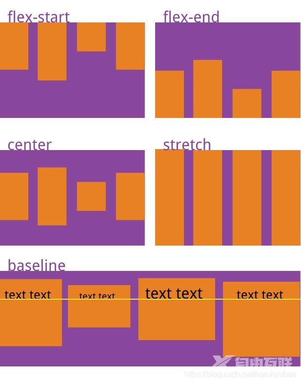 - flex-start:交叉轴的起点对齐。 flex-end:交叉轴的终点对齐。 center:交叉轴的中点对齐。 baseline:
