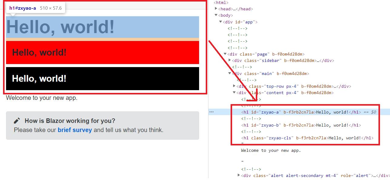 /* /Pages/Counter.razor.rz.scp.css */h1[b-g5zg69lne1] { font-size: 16px; font-weight: 400;}/* /Pages/Index.razor.rz.scp.css */h1[b-f3rb2cn7la] { font-size: 48px; font-weight: bold;}在浏览器中查看DOM元素,其结果如下: