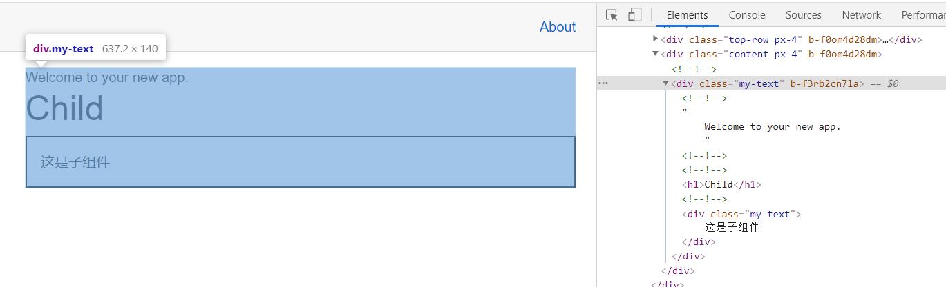 如果本组间没有唯一的父元素标签,则本组间中的每一个原生的HTML标签都会有相同的随机属性,例如下面这个组件,其“div”与“h1”都会具有相同的随机属性,并会用改属性替代“::deep”标识。“Child“组件中的元素将不会出现改随机属性。
