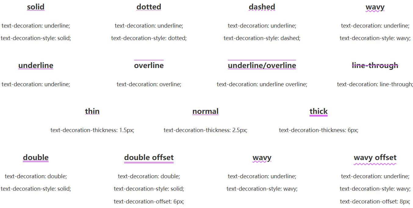 而到了比较新的 CSS Text Decoration Module Level 3 - text-decoration,text-decoration 得到了比较大的丰富更新,演化出了 text-decoration-line, text-decoration-color, text-decoration-style,和还未成为标准的 text-decoration-thickness 等属性,是它们的缩写。