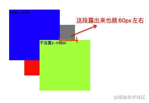 灰色测试块被蓝色和绿色块所覆盖。显然易见,即使test元素的z-index为10,也无法展示在层叠上下文的最上层。因为test隶属于它的父元素red创建的层叠上下文。当一个元素产生了层叠上下文,其子级层叠上下文的z-index值只在父级中才有意义。所有灰色块的z-index只在红色块里生效。