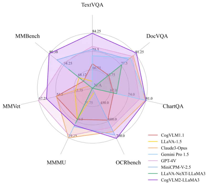 在TextVQA、DocVQA等多项基准测试中,CogVLM2以较小模型尺寸取得SOTA成绩,部分指标媲美GPT-4V等闭源模型。