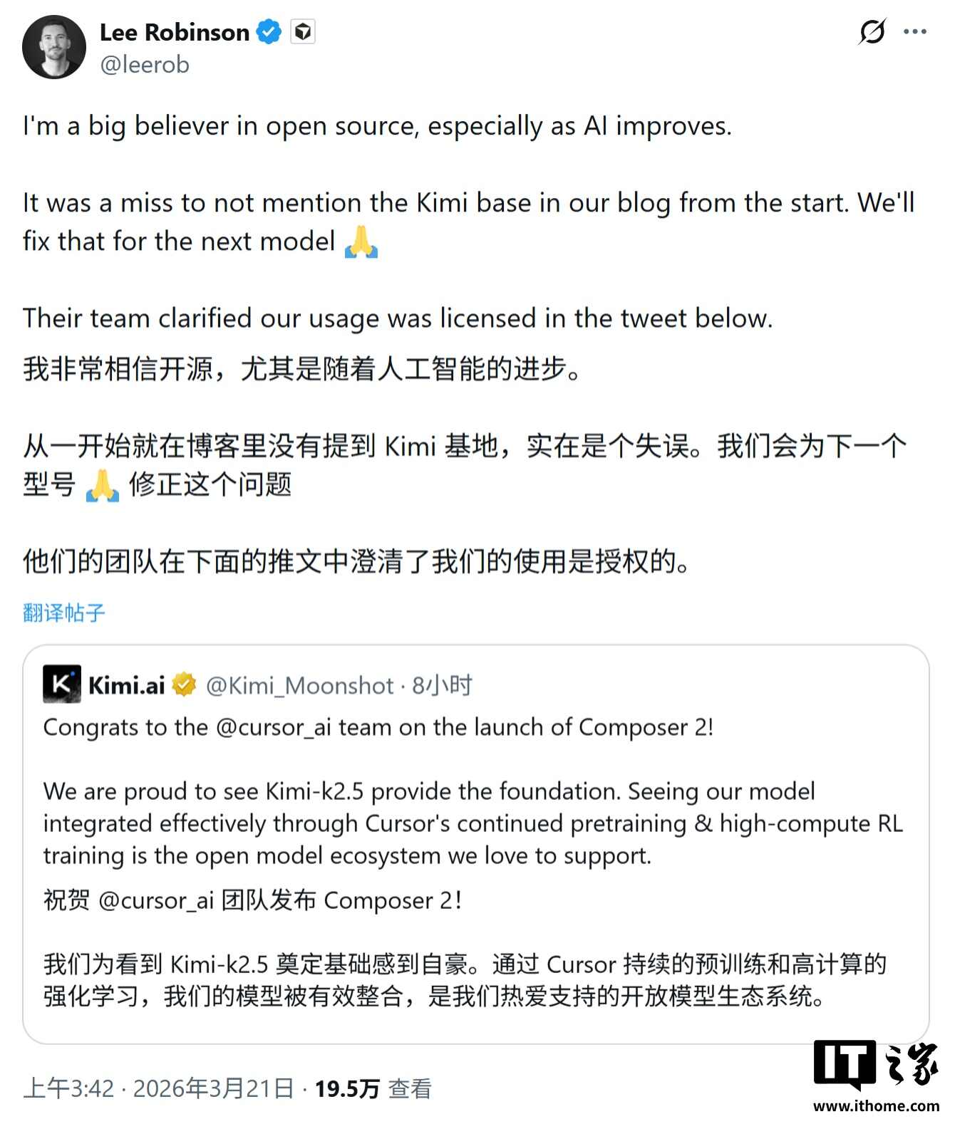 Cursor开发者体验副总裁Lee Robinson对此事做出回应,承认在发布初期未提及Kimi基础模型确实是个疏忽,并表示将在后续产品中改进这一情况。