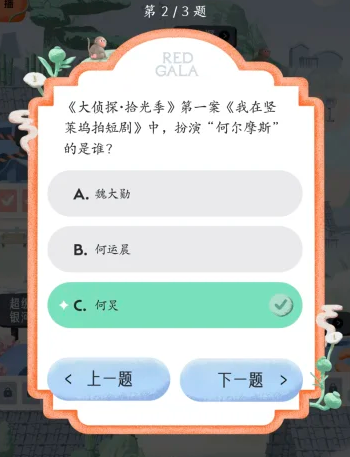 15、《大侦探·拾光季》第一案《我在竖莱坞拍短剧》中,扮演"何尔摩斯"的是谁?何炅