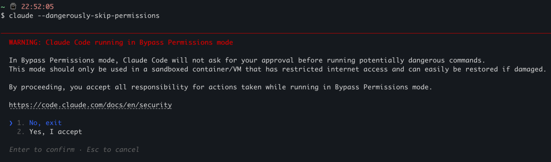 免责声明:虽然说 Claude Code 只有在极度发疯的情况下才会去破坏你的电脑,这种概率可以说是微乎其微,但是必须要提醒大家,这个选项会让 Claude Code 彻底放飞自我,所以理论上还是有一定的危险性的。