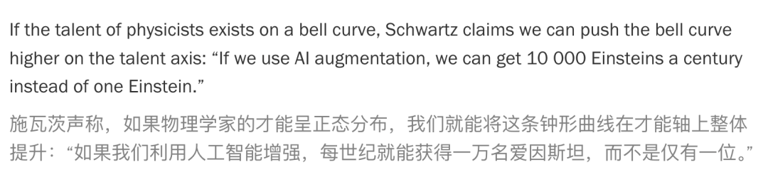 如果说物理学家的天赋分布符合正态分布(钟形曲线),Schwartz认为,我们可以利用AI把这条曲线,在天赋轴上推向更高点: