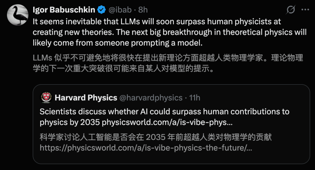xAI联创Igor Babuschkin同样认为,LLM在构建新理论方面,超越人类物理学家是迟早的事。
