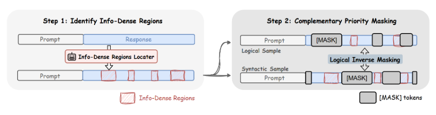思路是:对同一条样本,Trainer 不只根据前文的 token-level 优先标记构造一个 priority mask,还会构造它的完全逻辑互补版本。也就是说,一份样本会变成两种互补的训练视角:一种把重点放在逻辑骨架上,另一种则更多保留这些关键位置,转而让模型去处理结构、语法和上下文连贯性。