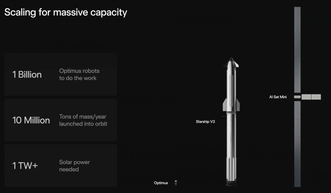 马斯克说,SpaceX 的 Starship 是整个体系中的关键,因为要实现每年太瓦级计算能力,大致需要每年向轨道运输约 1000 万吨物资(按每吨 100 千瓦计算)。这一目标并不需要突破物理学边界,是可以实现的。
