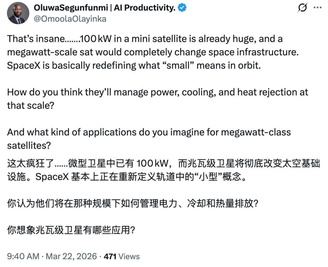 在这套设想中,马斯克特别提到了微型 AI 卫星(AI Sat Mini),它的功率为 100kW,未来功率将进入兆瓦范围。