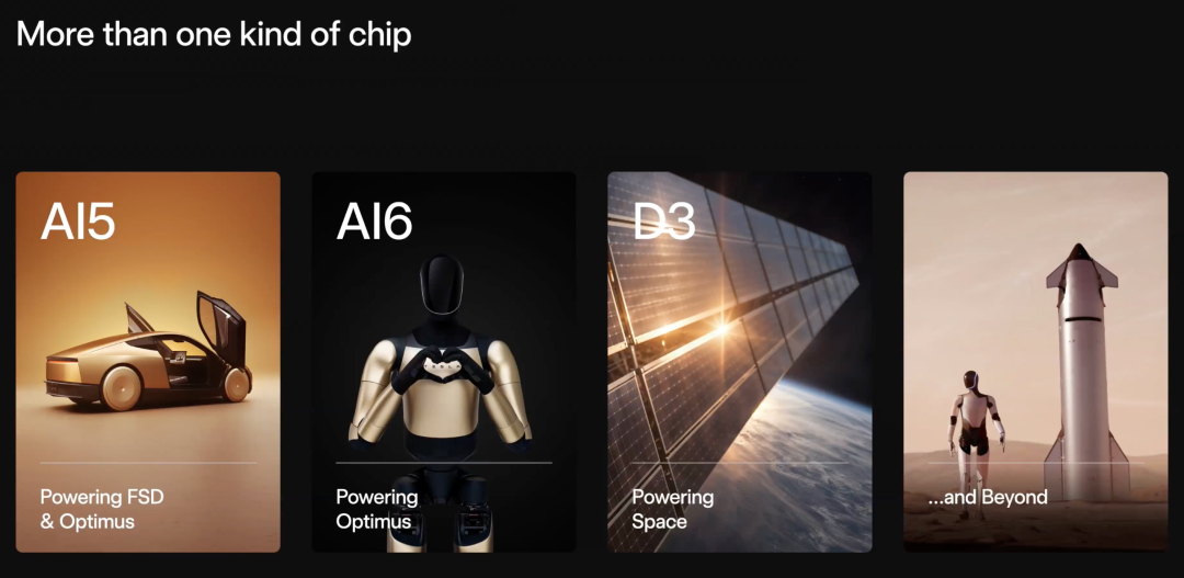与传统半导体厂只聚焦单一芯片不同,Terafab 的构想更接近一套「分层计算体系」:从支撑自动驾驶与人形机器人的地面 AI(AI5/AI6),到面向轨道与太空能源系统的 D3,再到未来星际场景的扩展能力。
