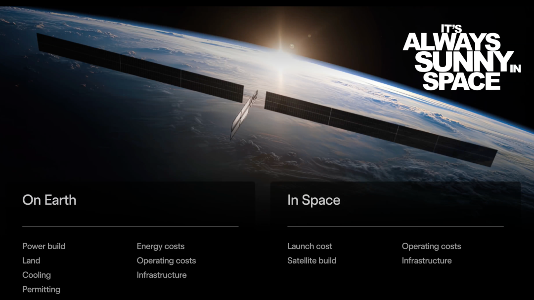 而在太空中,太阳能几乎是无限的,环境天然适合散热,也不再受制于传统基础设施。