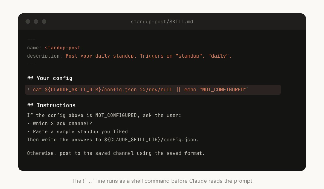 有些 Skills 可能需要用户提供上下文信息来完成设置。例如,如果你在制作一个将站立会议内容发布到 Slack 的 Skills,你可能希望 Claude 询问要发布到哪个 Slack 频道。