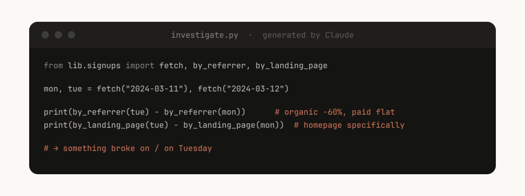 在你的数据科学 Skills 中,你可能有一组用于从事件源抓取数据的函数库。为了让 Claude 执行复杂的分析,你可以为它提供一套像这样的帮助函数: