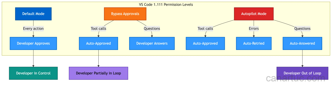 VS Code 1.111 为 Copilot Chat 带来了三种权限模式:Default、Bypass Approvals 和 Autopilot。