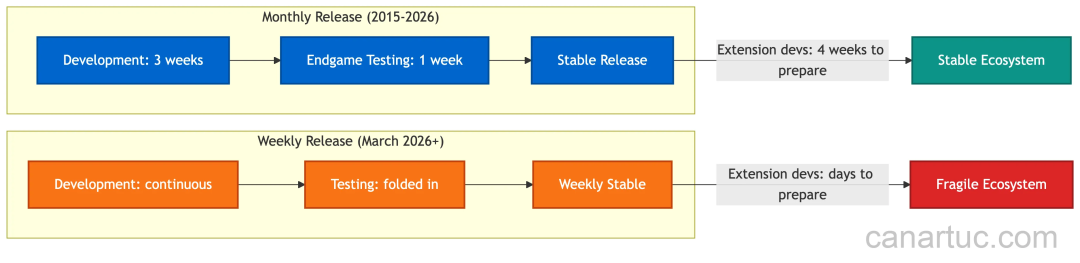 这意味着,扩展开发者手里的验证时间,从原来的几周,被挤压成了几天;用户面对每个新版本时,也几乎失去了原本那段“烘焙时间”。那些原本会在 endgame 测试周里被发现的问题,如今更有可能直接进入稳定版,落到真实用户头上,然后才被人意识到。