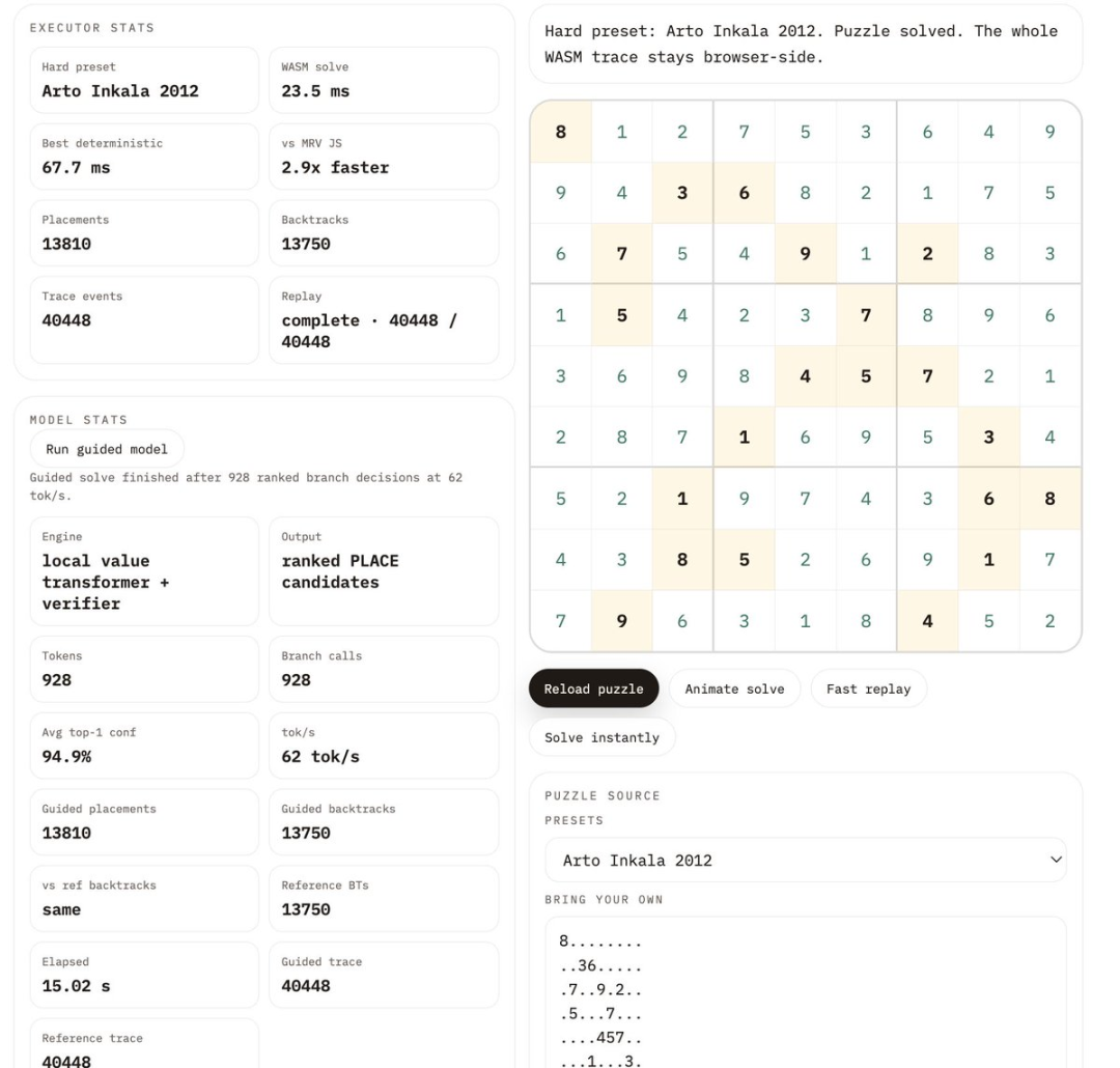 更离谱的是,这台「计算机」几秒就能跑完百万步的程序。连做最难的数独,正确率都是100%。