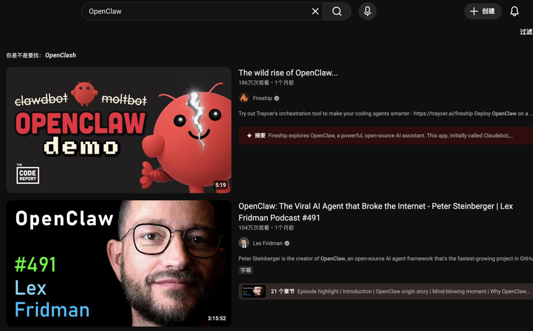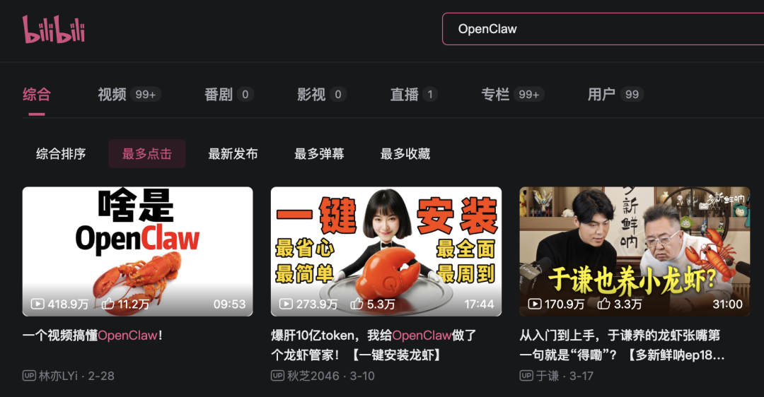 B 站上,与它相关的爆款视频接连出现:林亦LYi 的《一个视频搞懂OpenClaw!》播放量超 400 万,而这个数据已经超过了 YouTube 的 OpenClaw 主题下最高播放视频(播放量目前不足 200 万)。