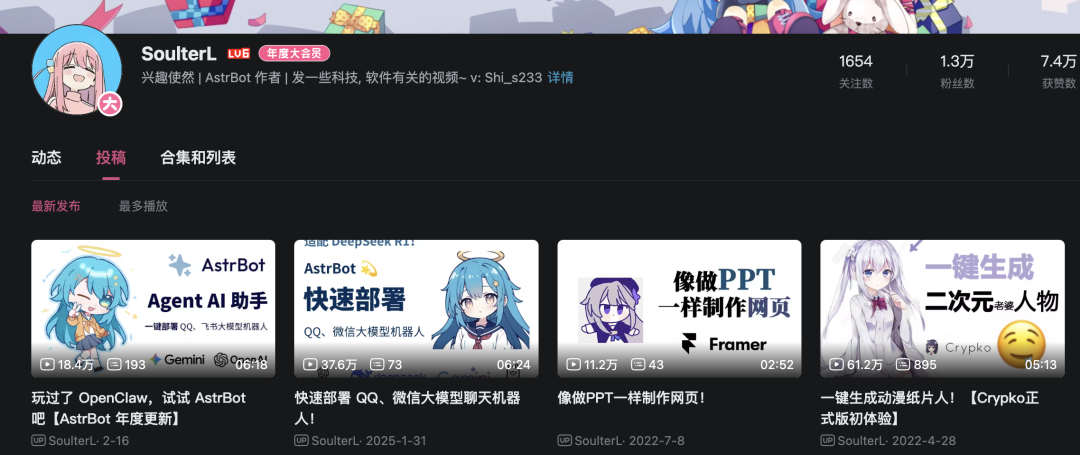 但在这股热潮到来之前,B 站 UP 主 Soulter(B 站 ID:SoulterL)已经在做一件与 OpenClaw 看起来很相似的事。