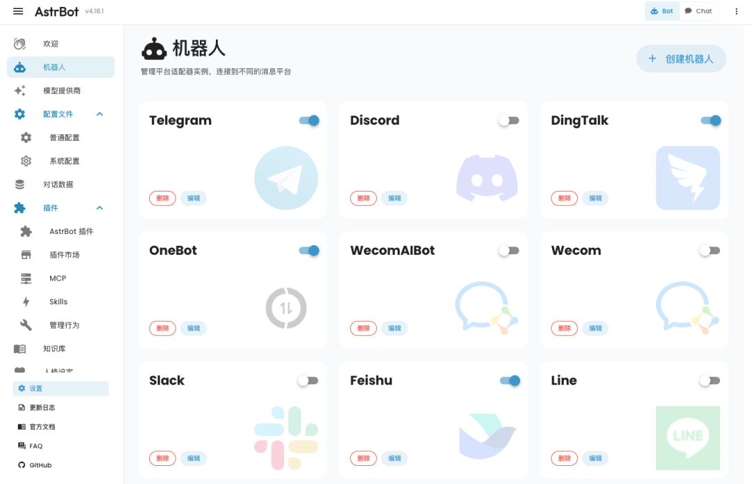 这个项目后来逐渐长成一个开源的 Agentic 聊天机器人编排平台,可以把多种 AI 能力接进多个即时通讯平台里,支持 QQ、企业微信、飞书、钉钉、T@elegrimm、Slack 等渠道,也有 WebUI、Agent 沙箱、Sub Agents 和插件体系。