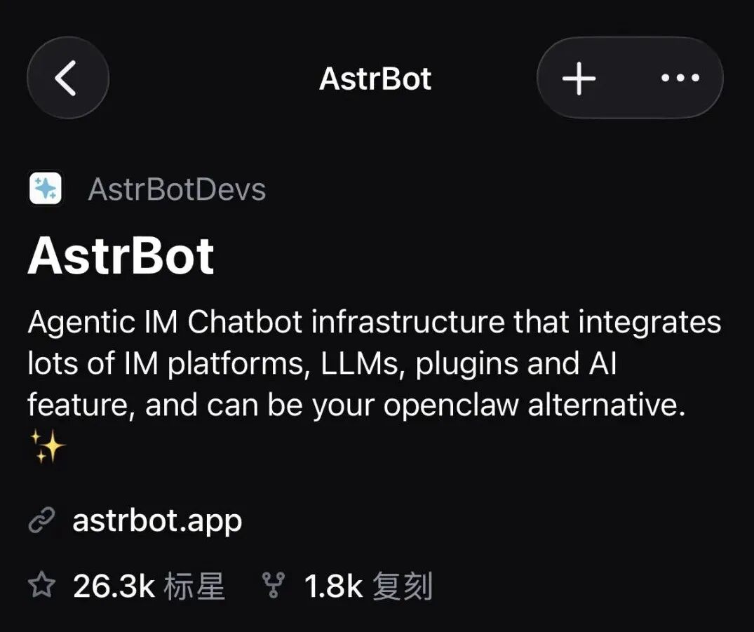 到 2026 年 3 月,AstrBot 在 GitHub 上已经来到 2.6 万 Star、1800 多个 Fork、234 位贡献者,官方 README 里写着「1000+ 插件可一键安装」。