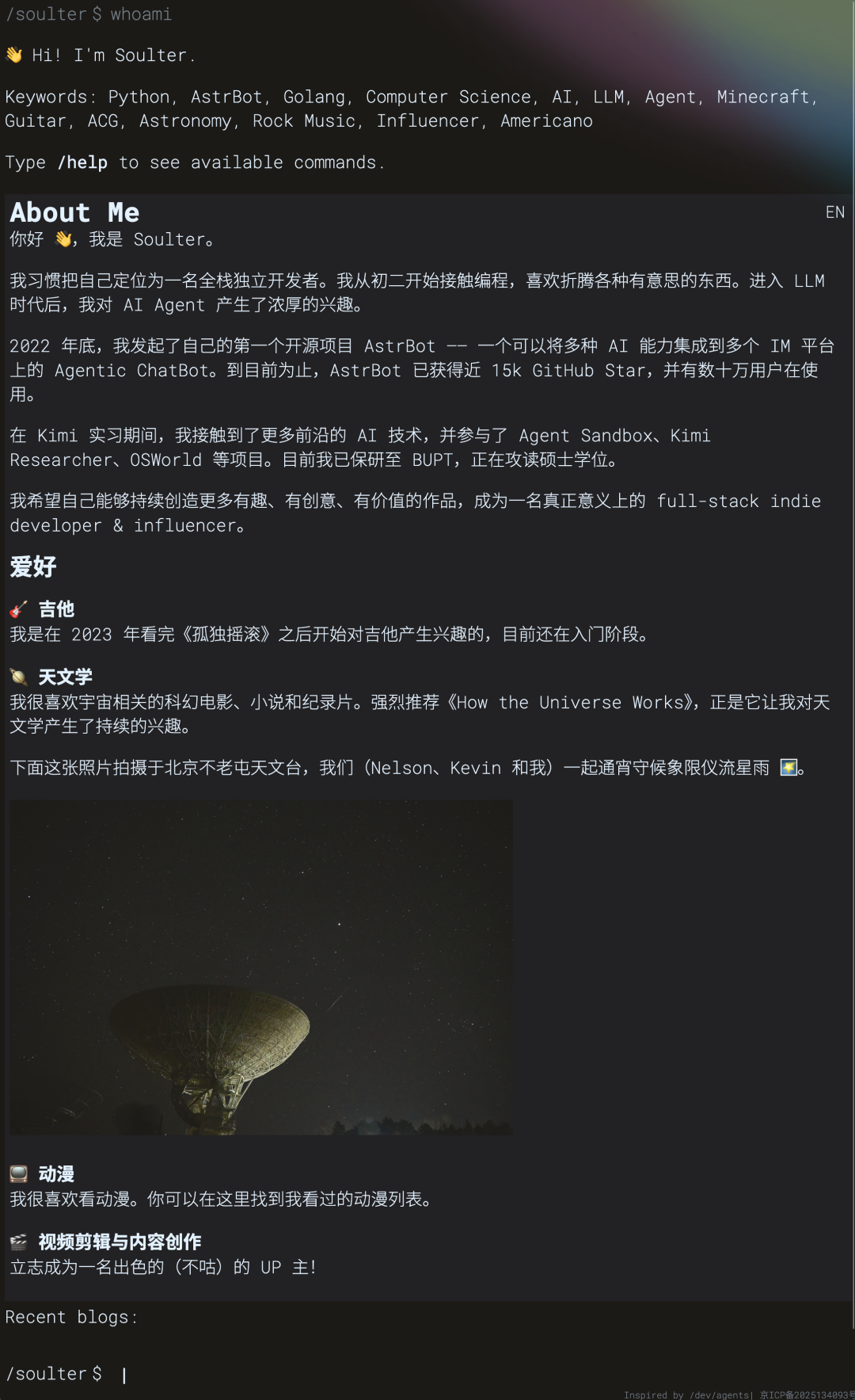 他的个人博客里,他称自己为「全栈独立开发者」,目前在北京邮电大学就读,除了 AstrBot,还喜欢动漫、吉他,是天文爱好者,也长期活跃在 GitHub 开源社区。