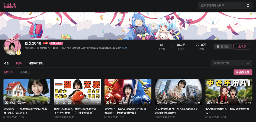 你很难把这类开发者粗暴归进「技术博主」或者「二次元 UP 主」任意一栏,他更像是 B 站那种典型的混合型创作者: